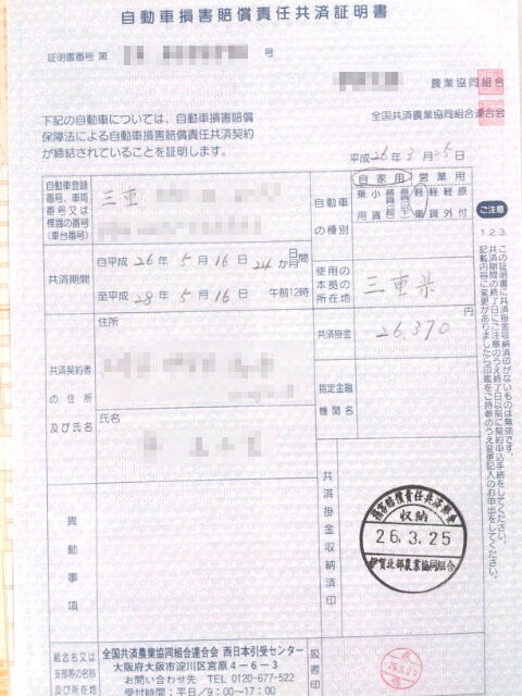 左側)自動車損害賠償責任保険証明書又は自動車損害賠償責任共済証明書