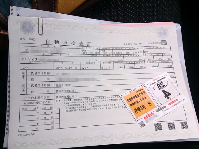 右側)自動車検査証。シール写ってるけどシールはいらないよ!